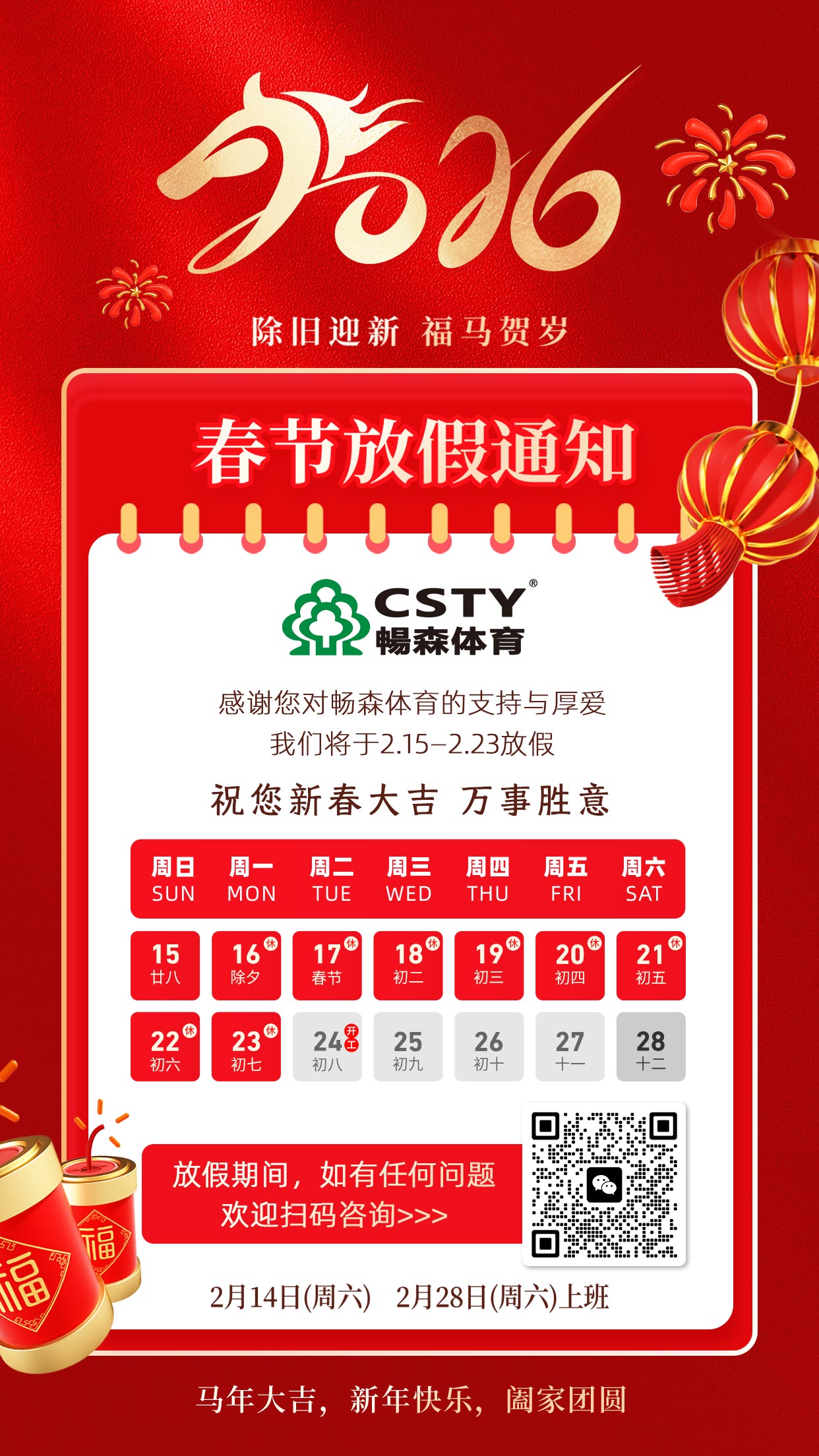 新春的脚步越来越近,空气里已经开始弥漫团圆的年味。过去这一年,感谢您一路以来的信赖、支持与并肩前行。在此,马年新春来临之际,北京畅森体育科技有限公司全体同仁,提前向您及家人致以最诚挚的祝福:祝您和家人马年大吉,一马当先,事业旗开得胜,生活万马奔腾!