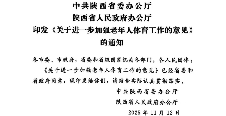 前不久,陕西省政府出台了《关于进一步加强老年人体育工作的意见》,专门针对老年人健身这件事 “划重点”,明确要健全更高水平的老年人健身公共服务体系。