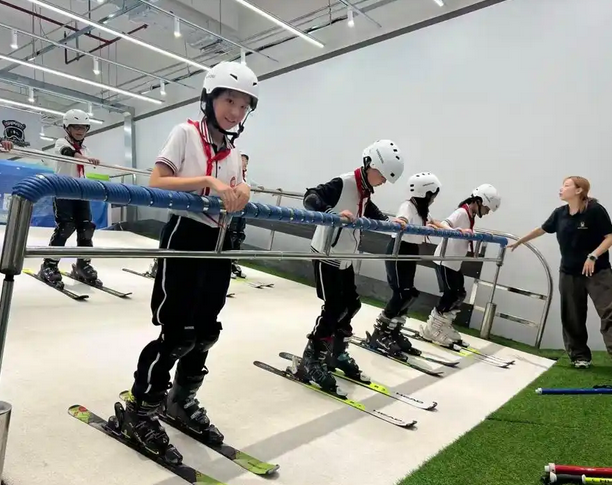 学校主动联系了旁边的东方体育中心,把体育课“搬”了过去。卡丁车、室内攀岩、滑雪机这些项目,学校自己肯定建不起,但专业的体育场馆里全都有。